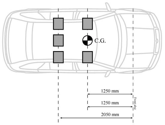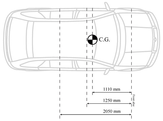 In this work, the vehicle is considered to be fully loaded when it has five passengers with a weight of 80 kg for each of them. These masses cause the movement of the center of gravity towards the rear of the vehicle, so and are modified. This also results in a change of moment of inertia. In Table 1, the reader can check the difference between the car empty and loaded. Figure 7 and Figure 8 depict how the distribution of masses aboard the car influences the location of the center of gravity.