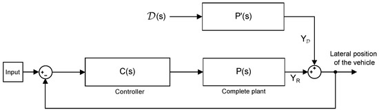 To study the system in terms of disturbance rejection, the gain of the system (closed-loop controller and plant) must be calculated when an external force input is applied to the plant. The system is described in Figure 9 where is the force produced by the wind on the vehicle. In this case, it is assumed that the additional force affects only to of the state vector and it is perfectly applied in the center of gravity of the vehicle, so it does not produce any momentum. The system used to calculate the incidence of the wind in the trajectory of the vehicle is , and the system is defined by Equation (1) with a different B matrix, , which adapts this force input and transforms it into acceleration.