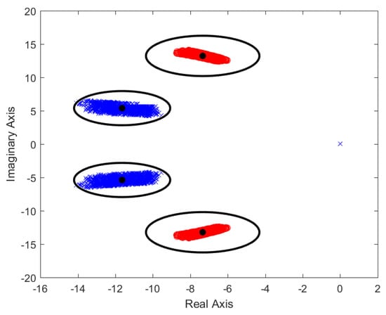 A random parametric sweep, using the values from Table 2, was performed to obtain a realistic set of vehicle plants that could be used to obtain a fine prefilter. Since a pole/zero is deemed to be adequately canceled if the zero/pole employed for its elimination is located within a circle with a radius equivalent to the 20% of the total distance existent from the origin of coordinates to the zero/pole, the best way to ensure a good cancellation of all the possible plants is to place the zero/poles of the prefilter at a point equivalent to the arithmetic mean of the cloud of points obtained by the parametric sweep. The gain of the prefilter is obtained through the same way, its value being the inverse of the arithmetic mean of all the different plant gains. As an example, Figure 12 has a depiction of the zero-pole positions (black dots) and the surrounding areas of cancellation for a randomly generated parametric sweep for a longitudinal velocity ranging from to m/s.