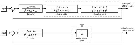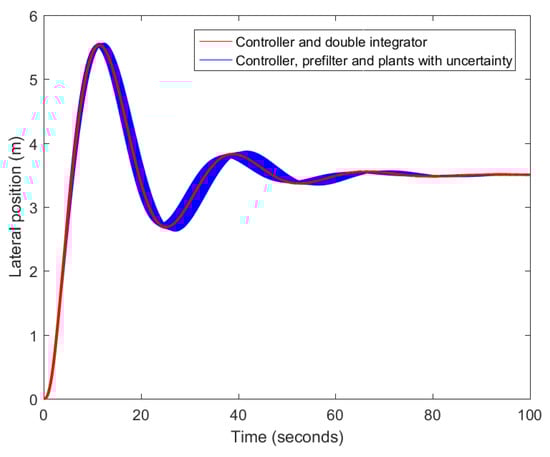 Using the final base linear controller, with the following realization and whose design is explained in Section 3.3, the randomly generated plants, prefiltered by using the arithmetic mean of the scattered clouds of zero-poles and gains of the plant, are compared to the system resulting from combining the controller with a double integrator. In this way, the effectiveness of the prefilter can be graphically confirmed in terms of the output of the system, the lateral position of the vehicle. After inspecting the outcome presented in Figure 13, it can be concluded that assuming a zero-pole cancellation for a particular velocity is convenient. Figure 14 depicts the equivalent system of a perfect zero-pole cancellation.
