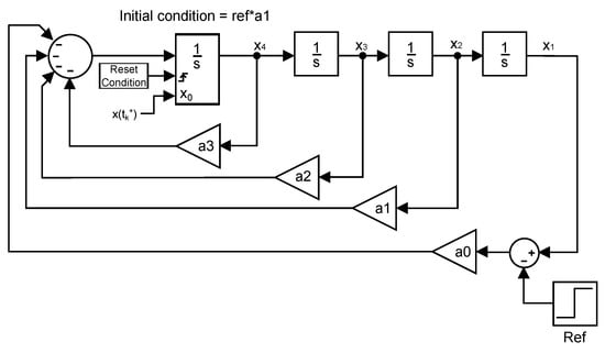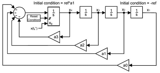 The fact needs to be taken into consideration that, in order for the canonical form to be equivalent to the system in Figure 14, the initial condition of the reset integrator has to be adapted to obtain a response equal to that of the original system. Figure 15 shows a representation of the canonical form where it can be appreciated that the reset action is directly applied to the jerk state, as reported above.