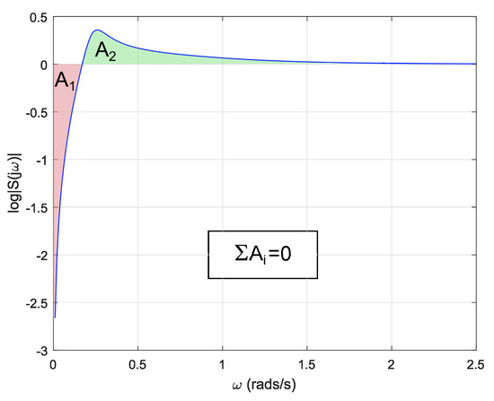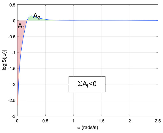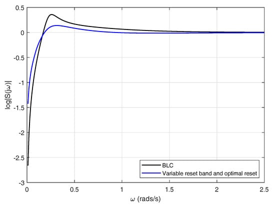 As mentioned previously, in addition to constraints on the time domain, linear systems also exhibit restrictions on the frequency domain. Endowing a linear controller with a reset strategy may redound to improvements on the frequency response of the system. It can be concluded from Figure 26 that using a variable reset band with optimal reset yields a controller with an enhanced frequency response. The base linear controller presents a maximum around rad/s, whereas the reset controller attenuates that peak. Computing the sum of the areas of the estimated sensitivity function in the reset case produces a value different from zero , the positive area being equivalent to % of the negative area. This is due to the fact that the BLC is restricted by Equation (18) while the reset controller is not, for this reason a suppression of the sensitivity function at some frequency range does not necessarily imply an increment in other frequencies.