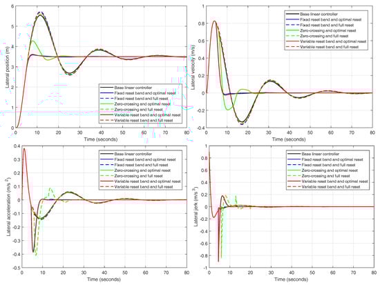 As it was said in Section 3.2, a linear controller cannot satisfy all the design requirements at the same time. If the controller is designed to be robust against disturbances, the requirements of low acceleration and jerk cannot be satisfied. In addition, if it is designed with respect to the comfort limits, it can satisfy other requirements but not all of them. Reset control allows for designing a robust system at the same time that high performance as well as low overshoot is achieved.