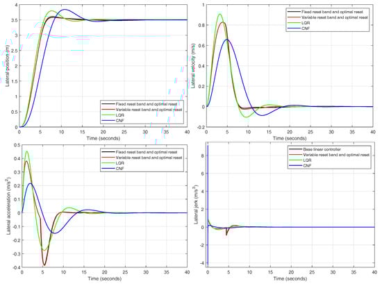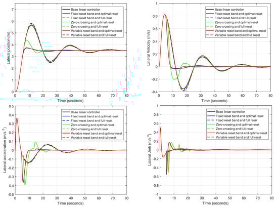 The comfort limit imposes the maximum variation of the reset state in order to not impoverish ride quality. If after resetting the state, exceeds the maximum allowed jerk, will be limited as indicated in Equation (13). As far as acceleration is concerned, although it is not directly limited, by obtaining a good base linear controller, with a sufficiently smooth response, the vehicle will operate far from the comfort boundaries. Therefore, whenever a reset action occurs, only jerk but not acceleration will be at risk of exceeding the comfort limits. Likewise, yaw rate is not directly limited due to the fact that the imposed comfort requirements combined with limitations on rise time, settling time and overshoot will confine the values of this magnitude in a safe range of operation. The results in the following sections confirm that this approach gives rise in practice to acceptable ranges of acceleration and yaw rate: