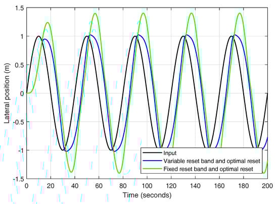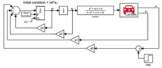 The states of the system are = position, = velocity, = acceleration, = jerk. As it can be seen, the states and are taken from CarSim software directly instead of getting them from integrator blocks. The states and are part of the controller, being this last state, , the selected state to be reset to a different value every time the reset condition is reached, as it was explained in Section 3.1.