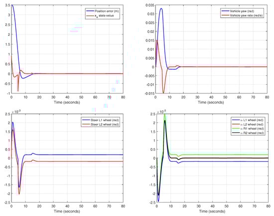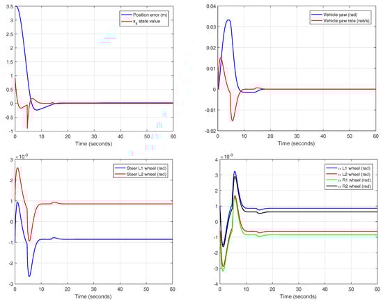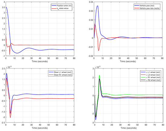 The system input is the steering angle of the front wheels. In this case, the reset action does not require excessive effort in the actuator, keeping the values in a low range. Since the slip angles are also restricted to small absolute values, the assumptions made in the theoretical approach are confirmed.