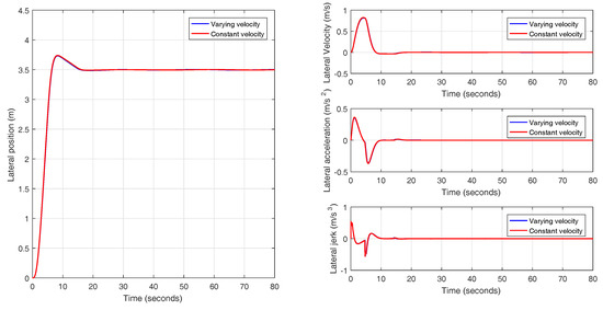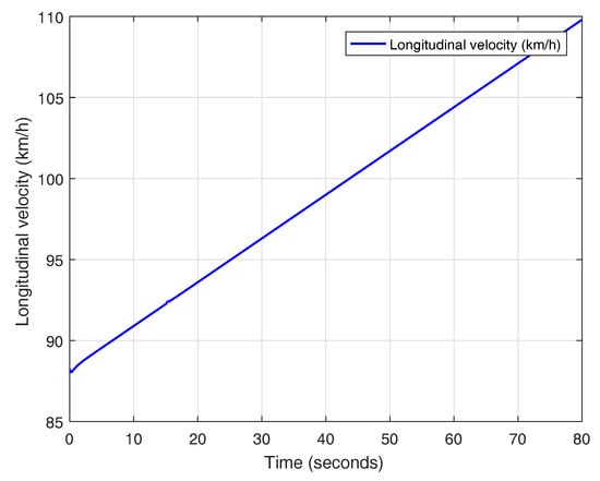 In this experiment, a lane change maneuver is performed with an initial speed of 88.2 km/h (24.5 m/s) with a uniform increase of velocity to a final value of 109.8 km/h (30.5 m/s), as it is shown in Figure 30. The results obtained for the lane change maneuver with varying velocity are depicted in Figure 31. Based on what has been observed, it can be concluded that switching the prefilter does not affect the performance of the system and the prefiltered plant behaves as a double integrator, as it was explained in Section 3.2.