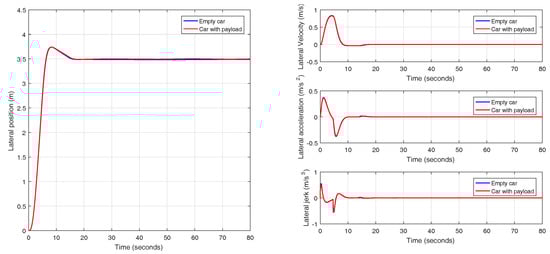 In this case, a car traveling at a speed of 90 km/h is selected and the passengers are distributed as it is shown in Figure 8. In Figure 32, the comparison between the response (position, speed, acceleration and jerk) of an empty and a loaded vehicle can be seen. Figure 33 shows other parameters. The response of the loaded car is very similar to the response of the empty car, and this is mainly due to the preciseness of the calculated prefilter, which reduces the influence of variability in the model parameters.