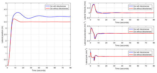 In the next experiment, the effect on the vehicle of an external force is analyzed for the maneuver under study. As mentioned above, although the main functionality of the controller is to provide a swift and smooth lane change, the system must exhibit a certain degree of disturbance rejection for the sake of safety. A lateral force representing the wind, which induces a deviation in the car position, can be set in CarSim.