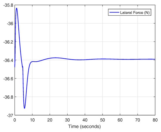 The experiment is performed by establishing a wind force value on the right side of the vehicle, where lane departure is more dangerous. The results of the experiment are shown in Figure 34 and Figure 35. For a controller with a variable reset band and optimal reset, the system has an overshoot of 0.24 m without any disturbances (6.8%). Since the trajectory of the car has to be inside of the lane width (4.25 m), the vehicle has 0.51 m left within the lane. In this case, the average force value admitted by the controller is 36.4 N (see Figure 36). Thus, the gain of Equation (7), with a value of 0.014 m/N, is not as good as the gain of the theoretical model. In any case, this is not considered a problem because, as mentioned before, the compensator focuses on changing lane and it could be replaced by a lane keeping controller as soon as the maneuver has been completed.