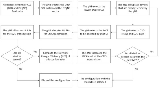 The EED2D-SF follows an iterative approach analyzing all possible combinations of multicast (from gNodeB to relays) and D2D (from relays to cell-edge devices) connections, and follows the steps shown in the flow chart in Figure 2. In particular, the gNodeB receives CQI feedbacks from all devices regarding both the device-to-gNodeB (D2gNB) and the D2D links. The D2gNB CQIs are candidates as potential CQIs for the CMS in the downlink subframes. Then, starting from the lowest device-to-gNodeB CQI and increasing it at each iteration, the gNodeB determines the subgroup of devices that can receive data via multicast directly from the gNodeB for the considered CQI. The selected multicast devices at a given iteration are those that, according to their channel conditions (the CQI under investigation), are able to receive data sent from the gNodeB with the currently selected MCS. Then, a subset of these nodes must be selected as relays towards the devices out-of-coverage from the multicast transmission. Specifically, the relay nodes will be those allowing to serve the highest number of out-of-multicast-coverage sensor/machine nodes. Then, the MCS to be used for D2D communication is chosen as the most robust among those supported by the selected relay nodes, in order to exploit the single frequency operation. If all devices are served through either CMS or D2D transmissions, the algorithm computes and stores the achievable NEE value as shown in Equation (3) for the current configuration; otherwise, the configuration is discarded. The algorithm stops when all configurations have been analyzed and the gNodeB selects the one that guarantees the highest overall network energy efficiency and provides service to all devices.