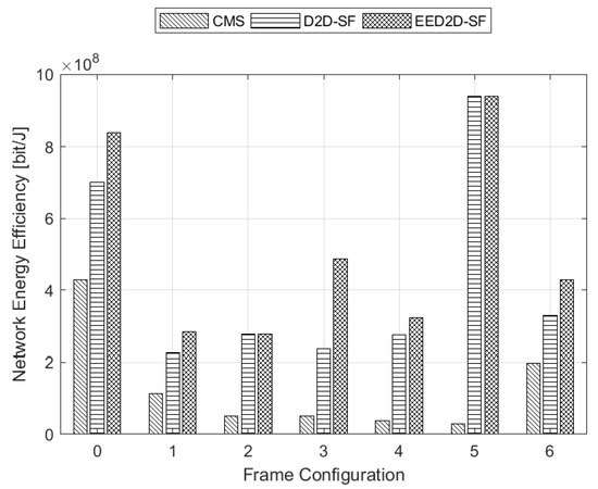 We first analyze the results achieved under Scenario A. Figure 3 shows the NEE achieved by the analysed schemes under all frame configurations foreseen by the NR standard. We notice that the traditional CMS approach exhibits really poor performance with respect to the other schemes. Furthermore, CMS reaches the highest NEE value for the frame configuration with the lowest number of DL subframes (i.e., frame configuration No. 0). On the opposite, the most performing solution in terms of NEE, as desired, is our proposed EED2D-SF that presents the highest NEE value for the frame with the highest number of DL subframes (i.e., frame configuration No. 5). We also notice that when the number of UL subframes in the TDD frame is low (frame configurations No. 5 and 2), both EED2D-SF and D2D-SF algorithms converge to the same NEE values.