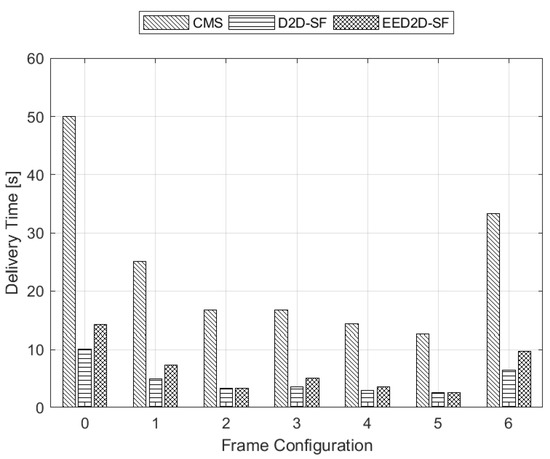 As expected, the higher the throughput, the lower the delivery time. Indeed, Figure 5 shows that frame configuration No. 5 offers the lowest delivery time, and it is classified as the frame configuration which achieves both the highest NEE and mean throughput in the shortest time interval.