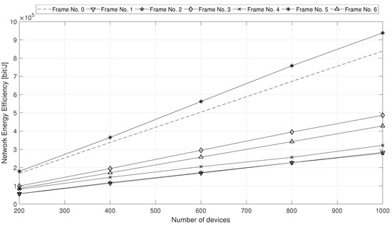 From now on, we focus attention only on the performance of the proposed EED2D-SF scheme. Hence, we analyze the results obtained in scenario B, where we assess how EED2D-SF works under an increasing number of devices (which varies from 200 to 1000). We evaluate the performance with all TDD frame configurations by analyzing NEE (Figure 6) and ADR (Figure 7) metrics.