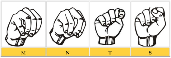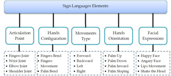 SL is a visual–spatial language based on positional and visual components, such as the shape of fingers and hands, the location and orientation of the hands, and arm and body movements. These components are used together to convey the meaning of an idea. The phonological structure of SL generally has five elements (Figure 1). Each gesture in SL is a combination of five building blocks. These five blocks represent the valuable elements of SL and can be exploited by automated intelligent systems for SL recognition (SLR) [22].