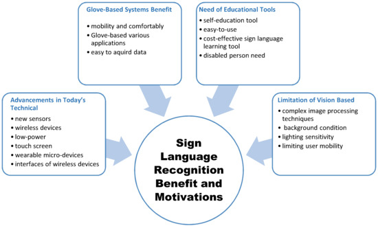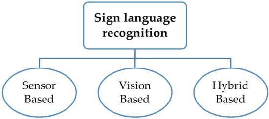 Scholarly interventions to overcome disability-related difficulties are multiple and systematic and vary according to the context. One of the important interventions is SLR systems that are utilized to translate the signs of SL into text or speech to establish communication with individuals who do not know these signs [18]. SLR systems based on the sensory glove are among the most significant endeavors aimed at procuring data for the motion of human hands. Three approaches (Figure 2), namely, vision based, sensor-based, and a combination of the two, are adopted to capture hand configurations and recognize the corresponding meanings of gestures [23].