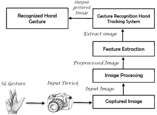 Vision-based systems use cameras as primary tools to obtain the necessary input data (Figure 3). The main advantage of using a camera is that it removes the need for sensors in sensory gloves and reduces the building costs of the system. Cameras are quite cheap, and most laptops use a high specification camera because of the blur caused by a web camera. However, despite the high specification camera, which most smartphones possess [18], there are various problems such as the limited field of view of the capturing device, high computational costs [24,25], and the need for multiple cameras to obtain robust results (due to problems of depth and occlusion [26,27]); these issues are inherent to this system and render the entire system futile for the development of real-time recognition applications. In [28], two new feature extraction techniques of Combined Orientation Histogram and Statistical (COHST) Features and Wavelet Features are presented for the recognition of static signs of numbers 0 to 9, of American Sign Language (ASL). System performance is measured by extracting four different features—Orientation Histogram, Statistical Measures, COHST Features, and Wavelet Features—using a neural network. The best performance of the system reaches 98.17% accuracy with Wavelet features. In [29], a system using Wavelet transform and neural networks (NN) is presented to recognize the static gestures of alphabets in Persian sign language (PSL). It is able to recognize 32 selected PSL alphabets with an average recognition rate of 94.06%. In [30], ASL recognition is performed using Hough transform and neural NN. Here, only 20 different signs of alphabets and numbers were used. The performance of the system was measured by varying the threshold level for Canny edge detection and the number of samples for each sign used. The average recognition rate obtained was 92.3% for the threshold value of 0.25. In [31], a vision-based system with B-Spline Approximation and a support vector machines (SVM) classifier were used for the recognition of Indian Sign Language Alphabets and Numerals. Fifty samples of each alphabet from A–Z and numbers from 0–5 were used, and the system achieved an average accuracy of 90% and 92% for alphabets and numbers, respectively. In [32], a 3D model of the hand posture is generated from two 2D images from two perspectives that are weighted and linearly combined to produce single 3D features aimed at classifying 50 isolated ArsL words using a Hybrid pulse-coupled neural network (PCNN) as the feature generator technique, followed by nondeterministic finite automaton (NFA). Then, the ‘‘best-match” algorithm is used to find the most probable meaning of a gesture. The recognition accuracy reaches 96%. In [33], a combination of local binary patterns (LBP) and principal component analysis (PCA) is used to extract features that are fed into a Hidden Markov Model (HMM) to recognize a lexicon of 23 isolated ArSL words. Occlusion is not resolved, as any occlusion states are handled as one object, and recognition is carried out. The system achieves a recognition rate of 99.97% in signer-dependent mode. A dynamic skin detector based on the face color tone is used in [34] for hand segmentation. Then, a skin-blob tracking technique is used to identify and track the hands. A dataset of 30 isolated words is used. The proposed system has a recognition rate of 97%. Different transformation techniques (viz. Fourier, Hartley, and Log-Gabor transforms) were used in [27], for the extraction and description of features from an accumulation of sign frames into a single image of an Arabic Sign language dataset. Three transformation techniques were applied in total, as well as slices from an accumulation of sign frames. The system was tested using three classifiers: k-nearest neighbor (KNN), SVM, and. Overall, the system’s accuracy reached over 98% for Hartley transform, which is comparable with other works using the same dataset.