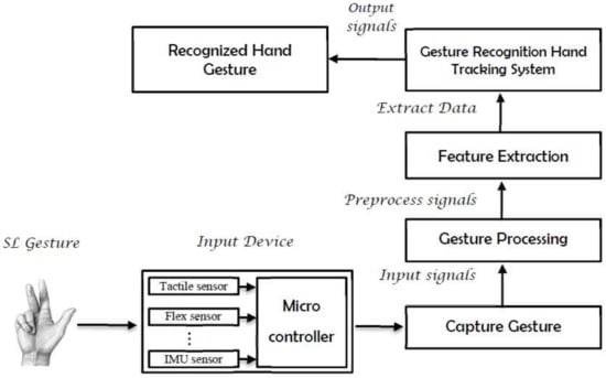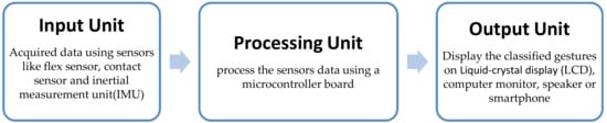 With regard to hardware components, the glove-based recognition system is composed of three main units (Figure 5): input, processing, and output.