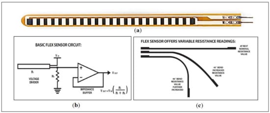 (a) Flex sensor, (b) flex bend levels, and (c)voltage divider circuit [2].