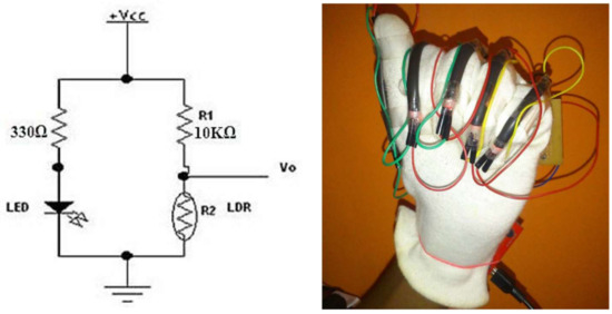 A circuit diagram of LED-LDR and the sensors’ positions on the glove [37].