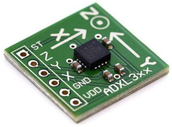 Considering that SL postures are made up of hand and wrist movements, they should be considered. Despite the benefits of using sensors to determine the shape of the finger, hand movements cannot be distinguished by these sensors. The features of the ACC sensor enable it to distinguish the movement and rotation of the wrist as another factor in addition to its capability to determine the shape of the finger. Therefore, the three-axis ACC that supplies the differences in acceleration along every axis is used to capture the orientation and movement of the wrist to correctly represent the important function of a sensor glove. The ADXL335 (Adafruit Industries, New York, NY, USA) (Figure 10) is a thin, small, low power, complete 3-axis accelerometer with signal conditioned voltage outputs. It measures acceleration with a minimum full-scale range 3g. This device measures the static acceleration of gravity in tilt-sensing applications and dynamic acceleration resulting from motion, shock, or vibration. The ADXL335 contains a polysilicon surface micro machined structure built on top of a silicon wafer. Polysilicon springs suspend the structure over the surface of the wafer and provide resistance against acceleration forces. A differential capacitor, consisting of independent fixed plates attached to the moving mass, measures the deflection of the structure. Acceleration unbalances the capacitor, which, in turn, results in a sensor output with amplitude proportional to the acceleration experienced. The price varies from $9 to $24 depending on ACC version.