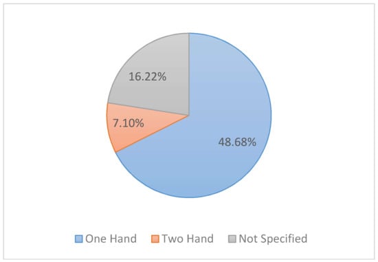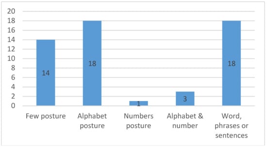 The attention given to the sensory glove is due to its capability to capture the data required to photograph the shape and movement of the hand for the purpose of recognizing the gestures of SL. Despite the fact that SL has plenty of postures, many studies have concentrated on a selective set of postures that may be as small as some letters of the alphabet [21,44,47,51,78]; or the postures of the most frequently used words [37,41,45,55,56,72,77,79]; or a combination of the alphabet, numbers, and words [6] to perform their experiments and develop an SLR system. Others have contributed to the expansion of the database of gestures allocated for the purpose of developing a system to distinguish them and make them include either whole alphabets [4,11,35,46,50,57,64,65,70], numbers within the range 0 to 9 [10], or both, in the same system [39,42,69]. Furthermore, others contributed to their endeavor to distinguish certain words and phrases, even sentences, chosen to cover a wide range of real-life circumstances, such as family, shopping, education, sports, etc. [54,73,74,75,78,80,81,82,83]. Figure 14 illustrates the number of articles in each variety of the aforementioned gestures.