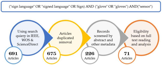 The databases, namely, Institute of Electrical and Electronics Engineers (IEEE), Web of Science (WOS), and ScienceDirect, have been adopted in this study, as they cover high-quality scientific publications (e.g., peer-reviewed journals, articles, conference proceedings, and workshop papers) related to computer science. Likewise, as suggested by [66], 691 articles, including 590 from ScienceDirect, 53 from IEEE Xplore, and 48 from Web of Science, were obtained as primary research findings. Sixteen duplicate records were eliminated through manual removal, thus yielding 675 unique papers for consideration. Screening of abstracts and metadata led to the further exclusion of 449 papers because they did not match any of our search queries. A total of 226 studies remained for full-text analysis. The analysis excluded 155 other records because of the failure to meet the inclusion criteria. Studies should be relevant to the development of an SLR system using a sensory glove, and should have accessible, online, full-text versions. Moreover, only publications written entirely in English have been accepted. Figure 15 shows the article selection process adopted in this study.