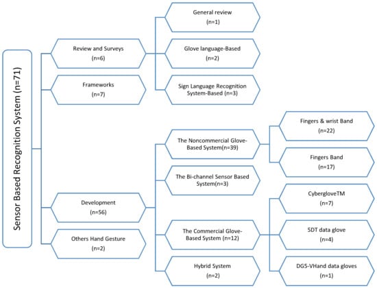 The majority of studies (56/71 papers) obtained through the research process belonged to the development category. These articles were classified into different topics and applications. The selected studies were categorized into subcategories based on the types of gloves and sensors used.