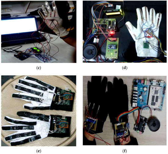 Finger bend detection glove used in the literature. (a) The glove consists of five 3-axis ACCs and (b) the ten custom-made flex sensors; (c) the translator system consists of five flex sensors mounted on glove, LCD and speaker;(d) the glove consists of three flex sensors used to detect few gestures; (e) the glove is equipped with five contact (pressure) sensors; (f) the wireless translator system is embedded with the five flex sensors and LCD.