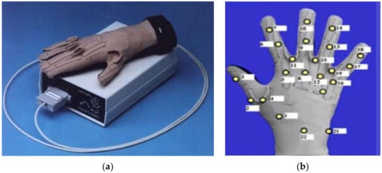 Glove systems. (a) Virtual Technologies’ CyberGlove and control box and (b) the location of 22 bend sensors on the glove [43].