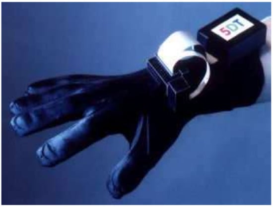 Only one work (1/12) in this literature review adopted the DG5 VHand data glove in the task implementation. Two real-time translators were developed for American SL. A DG5-VHand glove (Figure 21) was equipped with five bend sensors and a 3-axis ACC, which allows for sensing both the hand movements and the hand orientation. The gloves are suitable for wireless operations and are powered with a battery. The device costs about $750 for a wireless left-hand glove. A novel technique classified sequential data for Arabic SL using a pair of DG5 VHand gloves. The Modified k-Nearest Neighbor (MKNN) was used for the classification of a sensor-based dataset. The dataset consisted of 40 sentences, which were captured using two DG5-VHand gloves. The performance of the proposed solution reached 98.9% recognition accuracy [40].