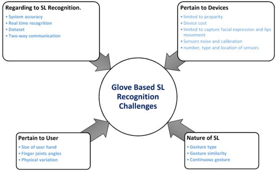 According to the statistics of the World Federation of the Deaf and the World Health Organization, approximately 70 million people in the world are deaf–mute. A total of 360 million people are deaf, and 32 million of these individuals are children [1]. The majority of speech- and hearing-impaired people cannot read or write in regular languages. Sign language (SL) is the native language used by the deaf and mute to communicate with others. SL relies primarily on gestures rather than voice to convey meaning, and it combines the use of finger shapes, hand movements, and facial expressions [2]. This language has the following main defects: a lot of hand movements, a limited vocabulary, and learning difficulties. Furthermore, SL is unfamiliar to those who are not deaf and mute, and disabled people face serious difficulties in communicating with able individuals. This communication barrier adversely affects the lives and social relationships of deaf people [3]. Thus, dumb people need to use a translator device to communicate with able individuals. This can be achieved by developing a glove equipped with sensors and an electronic circuit. Several benefits of using this device are that no complex data processing is needed [4]; there are no limitations on movements such as sitting behind a desk or chair; hand shape recognition is not affected by the background condition [5,6]; it is a lightweight, SLR-based glove device that can be carried to make mobility easy and comfortable [7,8]; and it is a recognition system that can be employed for learning SL for both dumb and able people [9]. Furthermore, numerous kinds of applications are currently involved in gesture recognition systems such as SLR, substitutional computer interfaces, socially assistive robotics, immersive gaming, virtual objects, remote control, medicine-health care, gesture recognition of hand/body language, etc. [10,11,12,13,14,15]. These benefits are described in detail in Section 5.1. The goal of this study is to survey glove systems used for SLR to obtain knowledge on current systems in this field. In addition, a roadmap is presented for technology evolution; it exhibits features of SLR systems and discusses the limitations of current technology. This objective can be achieved by answering the following six research questions: (1) How many types of relevant studies are published on glove-based SLR? (2) To what extent have SLR systems been elaborated on in the preliminary studies in terms of detail and technologies? (3) Which types of movements have been recognized in previous studies? (4) What types of sensors have been used in the primary publications? (5) What languages did the glove systems develop for SLR in the preliminary studies? (6) How were the effectiveness and efficiency of the SLR systems evaluated in the initial studies? The aim was to understand the options and gaps available in this field to support researchers by providing valuable insights into technological environments. The steps taken in this study to provide Systematic Literature Review and Systematic Mapping Study are in accordance with the steps explained in the David Moher paper [16] and other research papers [11,17,18,19,20,21].