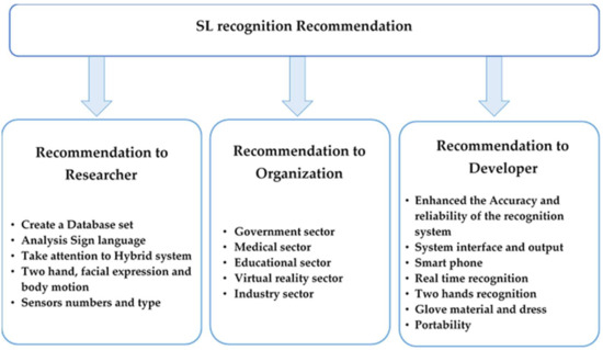 The importance of review articles is well recognized among those who work in research that aims to absorb new phenomena, introduce them to the research community, and extract meta-statistics to understand the possibilities and effects of phenomena on instituting change. Despite the importance of these type of articles, among the 71 studies, only six belonged to the review and survey category, which consisted of three groups, namely, general review [84], SLR system-based [17,84,85], and glove-based [11,21]. General review papers provide a complete picture of the glove system used with an explanation of its applications. Moreover, this type of paper analyzes device characteristics, provides a roadmap for technology development, and addresses the limitations of existing technologies and trends in research boundaries. Articles related to the glove-based system review the development issues of several current systems that are used as an interpreter ofspecific SL to communicate with the deaf and dumb. Through these papers, a definite comparative approach is achieved for the selection of suitable technology and for the translator systems of a particular SL. A recognition-based system provides an overview of the research onSLR, analyzes the essential components of SL, captures several methods and the recognition techniques that may help to develop a sign language recognition system with a wide vocabulary, and highlights the strengths and weaknesses of the developed systems.