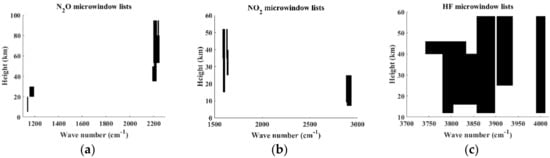 AIUS, a high-spectral-resolution spectrometer, has a strong correlation within channels and a similar spectral resolution and wavenumber range to ACE-FTS. Up to 69 microwindows are used in version 2.2 ACE-FTS for N2O retrievals [], 11 microwindows are selected in version 3.5 ACE-FTS retrievals for HF, and 21 microwindows are employed for NO2 retrievals []. Fewer and narrower channels and microwindows, respectively, were adopted in this work relative to ACE-FTS for the retrieval of the N2O, NO2, and HF profiles. This simplification was implemented to improve computational efficiency while maintaining acceptable accuracy. Wavenumber ranges of 1120–1300 and 2200–2250 cm−1 for N2O, 1560–1642 and 2890–2940 cm−1 for NO2, and 3700–4110 cm−1 for HF were selected based on these considerations. Figure 1 presents the intensity and distribution of the N2O, NO2, and HF absorption lines at a temperature of 296 K. Microwindow selection was performed based on the sensitivity analysis for interference molecules and target composition and the entropy of information principles according to the set weight function threshold. The Shannon information content is a scalar quantity which is defined qualitatively as the factor (in bits). The microwindows selected for N2O, NO2, and HF are shown in Figure 2. The x-axis indicates the position of the microwindows in the spectral band, and the y-axis represents the retrieval information at different tangent heights obtained from different microwindows. Finally, 126, 184, and 283 channels were selected for NO2, N2O, and HF, respectively. Number of channels (NC) and information content (IC) between ACE-FTS and simulating AIUS were computed and compared following equations of information content [], which are shown in Table 1. ACE FTS used 2040 channels with 6.92 bits of IC and simulating AIUS used 184 channels with 6.3 bits of IC for N2O retrieval. That is to say, simulating AIUS used 9% channels and retained 88% of the IC compared with ACE-FTS. Similarly, simulating AIUS has 6.69 bits of IC for NO2 and 6.43 bits of IC for HF, respectively, corresponding to 7.38 bits of IC for NO2 and 6.84 bits of IC for HF of AIUS. The probations of AIUS/ACE-FTS were 90% and 94% accordingly.