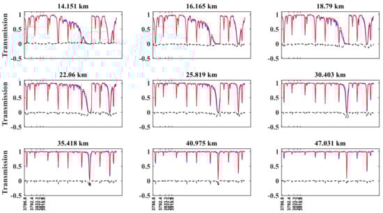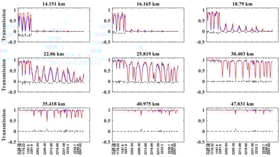 Reference transmission (blue curve), simulated transmission (red curve), and the difference between the real and simulated transmissions (black curve) for different tangent heights in N2O retrieving channels, by reference to sunrise orbit 40993 of ACE-FTS. The x-axis represents the wavenumber; the y-axis represents transmission.