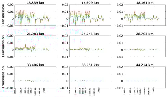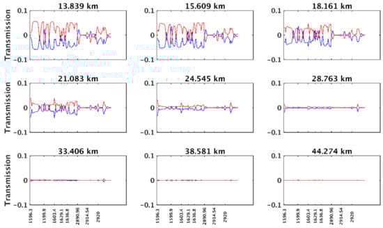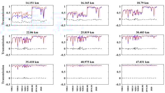Figure 4 shows the reference transmission, the simulated transmission, and their difference for NO2. For tangent heights below 50 km, the two real and simulated transmission values show excellent agreement, whereas for the tangent height of 14.151 km, the difference can reach 0.25.