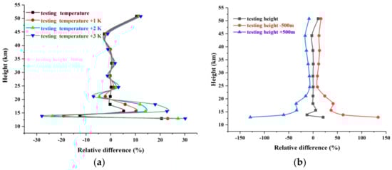 Figure 8 shows the relative differences between retrieval results and NO2 products of ACE-FTS under different errors in temperature and tangent heights. The errors in temperature and tangent height mainly affect the precision below the lower stratosphere (below 25 km). As can be seen from Figure 8, the impact caused by the error in tangent height (Figure 8b) is greater than the error in temperature (Figure 8a). By comparing the relative differences between relatively accurate temperature and the temperature with errors of 1 K, 2 K, and 3 K, it is found that a greater temperature leads to the greater retrieval difference, especially in the lower stratosphere. Above 25 km, the relative difference caused by the error in temperature becomes small, whereas a 1 K error in temperature causes a ~3% relative difference. An error of 500 m in tangent height can lead to ~20% retrieval error, while the retrieval relative differences are small under exact tangent heights below 25 km. However, the relative differences in the lower stratosphere (~13 km) are as great as ~140% under an error of ~500 m when the relative difference is ~10% under the relatively exact tangent height. Therefore, it is crucial to retrieve temperature profiles and correct the tangent point before the retrieval of other atmospheric species.
