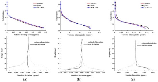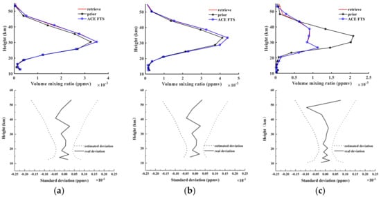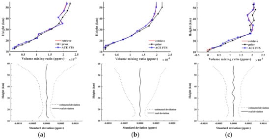 Figure 12 shows the retrieval results of NO2, the a priori profiles, and NO2 products from ACE-FTS level 2 for sunrise orbits 40993, 43544, and 48359. The notations used in Figure 12 are the same as in Figure 6. Figure 6a indicates that the retrieved profiles and ACE-FTS level 2 results show good agreement, corresponding to absolute RMSE values of 2.78 × 10−5, 2.15 × 10−5, and 1.32 × 10−5 ppmv and corresponding to relative RMSE values of 15.61%, 8.8%, and 15.87%. The atmospheric NO2 is distributed mainly in the stratosphere within the altitude range of 25–40 km and peaks at 30 km. The third retrieval results in Figure 12a indicate that the a priori profiles show high deviations from the ACE-FTS results, while the retrieval results fit the actual values quite well, which demonstrates that the retrieval algorithm used in the AIUS system can be quite stable. Figure 12b shows that the estimated deviations continually increase with height and that the real deviations fluctuate within the estimated deviations. The real standard deviations are less than 0.05 × 10−3 ppmv at almost all altitudes.