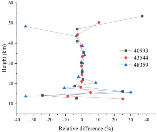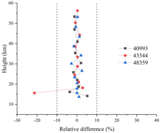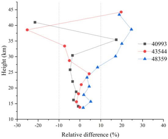 Additionally, the height-correlated relative errors for NO2 between the retrieval results and ACE-FTS results are calculated using Equation (8) for sunrise orbits 40993, 43544, and 48359. Each line in Figure 13 has the same meaning as the corresponding line in Figure 7 but shows the data for NO2. In the middle and upper stratosphere, the relative differences are less than 5%. In contrast, a sudden increase in the error is observed below 20 km and above 45 km, with the maximum error reaching ±40%. The reason for this behavior is that the noise is imposed uniformly at all tangent heights and that the amount of NO2 in this region is smaller than the amounts present in the middle and upper stratosphere.