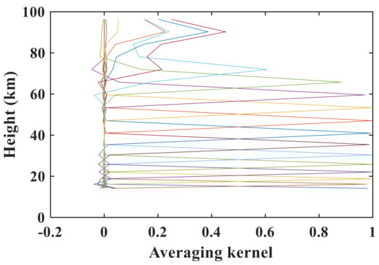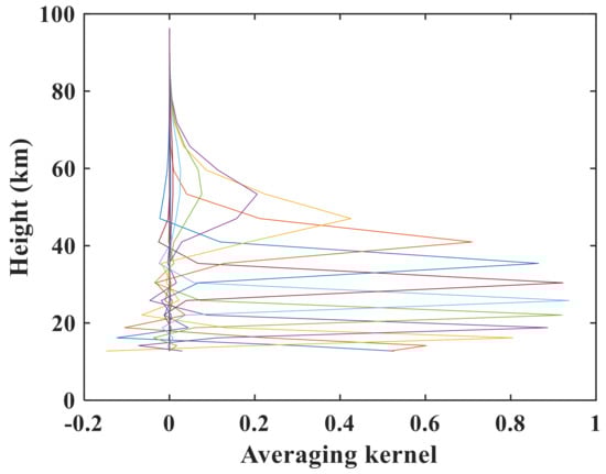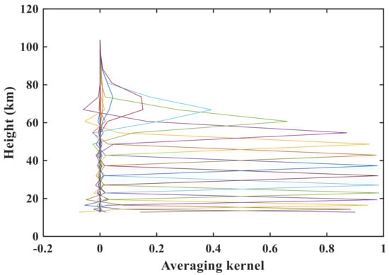 The vertical averaging kernel is the derivative of the retrieved profile with respect to the true profile [], which implies the weight of the true atmospheric state. For the optimal estimation formula, the averaging kernel matrix A is calculated as