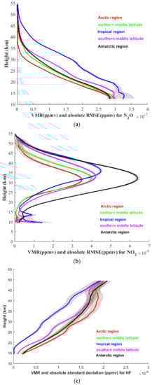 Mean volume mixing ratio (VMR) profiles and absolute standard deviations in five regions. (a) For N2O; (b) for NO2; (c) for HF.