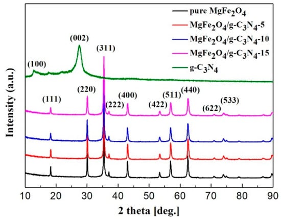 Figure 2 shows the XRD patterns of g-C3N4, MgFe2O4 porous microspheres and MgFe2O4/g-C3N4 composites with different g-C3N4 contents. We found that the diffraction peaks of MgFe2O4 were consistent with the standard pattern of MgFe2O4 (JCPDS card No. 17-0464) []. For g-C3N4, a strong peak appears at around 27.71° that corresponds to (002) diffraction plane (JCPDS card No. 87-1526) [], which is well-known for the melon network. Another peak at 12.81° corresponds to (100) ordering of tri-s-triazine units. However, there is no diffraction peak of g-C3N4 observed in the curves of MgFe2O4/g-C3N4 composites. This may be due to the relatively small content of g-C3N4 in the composite.