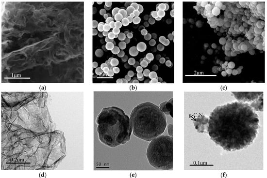 Scanning electron microscope (SEM) images of (a) g-C3N4; (b) MgFe2O4 porous microspheres and (c) MgFe2O4/g-C3N4 composite; as well as transmission electron microscopy (TEM) images of (d) g-C3N4; (e) MgFe2O4 porous microspheres and (f) MgFe2O4/g-C3N4 composite.