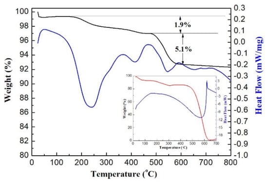 In order to determine the high temperature property of the g-C3N4 and MgFe2O4/g-C3N4-10, TG–DSC analysis was applied. As shown in Figure 4, there are three stages of weight loss in the MgFe2O4/g-C3N4 curve according to the peaks of DSC curve. The first stage in the temperature range of 100–300 °C is due to the desorption of adsorbed and trapped water and gas molecules. The reason of the second stage of weight loss between 300 °C and 450 °C is the removal of the primary solvent (ethylene glycol). The total lost weight of these two stages is 1.9%. The third stage corresponds to the temperature range of 475–635 °C in the TG curve of pure g-C3N4, which is due to the combustion of g-C3N4 in air (consistent with Figure 4 inset, the TG–DSC analysis of pure g-C3N4), and the weight loss of this stage is 5.1%. We proved that MgFe2O4/g-C3N4-10 composite could work normally without decomposing below the gas sensing test temperature of 475 °C.