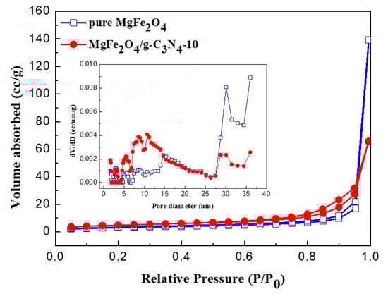 N2-sorption measurements of the as-prepared MgFe2O4 porous microspheres and MgFe2O4/g-C3N4-10 composite were further performed to investigate their specific surface area and porous structure. As shown in Figure 5, the nitrogen adsorption–desorption isotherms of the two samples show a type IV adsorption-isotherm according to the International Union of Pure and Applied Chemistry (IUPAC) classification, which is indicative of a mesoporous structure. The hysteresis loop of MgFe2O4/g-C3N4-10 samples belongs to H3-type, which demonstrates the presence of a laminated structure with narrow slits formed by MgFe2O4 microspheres and g-C3N4 sheet. Figure 5 (inset) depicts the pore size distribution curves of MgFe2O4 microspheres and MgFe2O4/g-C3N4-10 composite. It can be seen from Figure 5 that the pore diameter of MgFe2O4 and MgFe2O4/g-C3N4-10 composite is concentrated in the ranges of about 30–40 nm and 5–15 nm, respectively. This is in agreement with the TEM analysis results. The result illustrates that g-C3N4 fills the relatively large pores between the MgFe2O4 microspheres. The BET surface areas of MgFe2O4 and MgFe2O4/g-C3N4-10 samples were calculated to be 11.0 m2·g−1 and 16.8 m2·g−1, respectively.