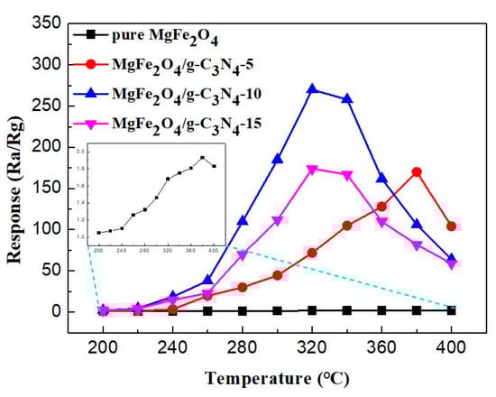 It is well known that the working temperature greatly influences the gas-sensing performance of MOS-based sensor because the gas adsorption and desorption and surface reaction kinetics are all closely related with the working temperature. Figure 6 shows the response of MgFe2O4 porous microspheres and MgFe2O4/g-C3N4 composites-based sensors to 500 ppm acetone at different operating temperatures. It can be seen from Figure 6 that all response curves of sensors exhibit “increase–maximum–decrease” trends with increasing temperature. Comparing different curves, the results demonstrate that the introduction of g-C3N4 into MgFe2O4 can greatly enhance the sensor’s response to acetone, with the best g-C3N4 content in MgFe2O4/g-C3N4 composites being 10 wt %. The MgFe2O4/g-C3N4-10-based sensor exhibits the highest response value to acetone (which is 275 at 320 °C). Meanwhile, the highest response of the sensor based on pure MgFe2O4 porous microspheres is 1.9 at 380 °C. Compared with the MgFe2O4-based sensor, the maximum response of the sensor based on MgFe2O4/g-C3N4-10 is improved by about 145 times and the optimum temperature is lowered by 60 °C.
