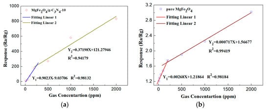 The response value of the sensors based on (a) MgFe2O4/g-C3N4-10 and (b) MgFe2O4 porous microspheres to the varied concentrations of acetone at the working temperature of 320 °C and their fitting linear.