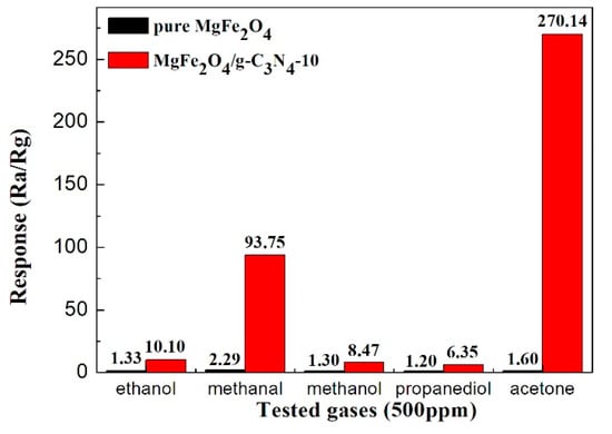 Response values of the sensors based on MgFe2O4 and MgFe2O4/g-C3N4-10 to 500 ppm of different types of tested gas at working temperature of 320 °C.