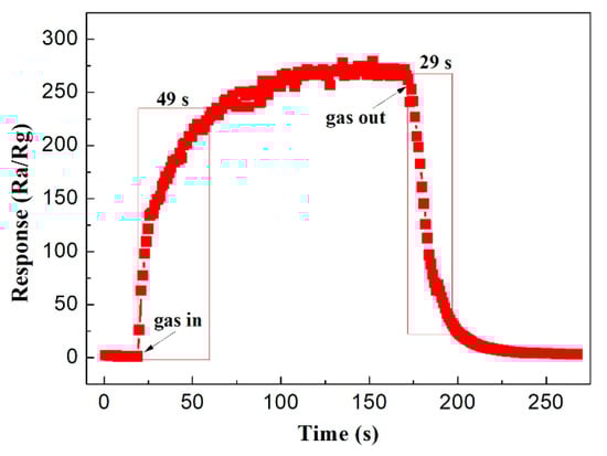 Response and recovery times are the important parameters of gas sensors, which are defined as the time required to reach 90% of the change of sensor resistance. The curve of MgFe2O4/g-C3N4-10-based sensor to 500 ppm acetone at a working temperature of 320 °C is shown in Figure 9. The response time and recovery time were calculated to be 49 s and 29 s, respectively. The result indicates that the gas sensing material of MgFe2O4/g-C3N4-10 possesses good response–recovery characteristics to acetone and could meet the requirements of practical applications.