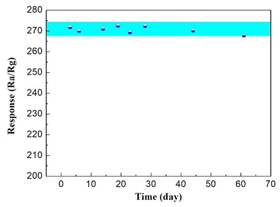 In order to evaluate the repeatability and stability of the gas sensing properties of MgFe2O4/g-C3N4-10 material over time, the sensor responses to 500 ppm of acetone were measured during a period of 60 days and the sensor structure was prepared by using the same drop coating method. Figure 10 displays the long-term stability test results of MgFe2O4/g-C3N4-10-based sensor in 60 days. There is a small change within a certain range in the response of sensor from this graph, which further confirms that the MgFe2O4/g-C3N4-10-based sensor might have a practical application based on its good long-term stability.